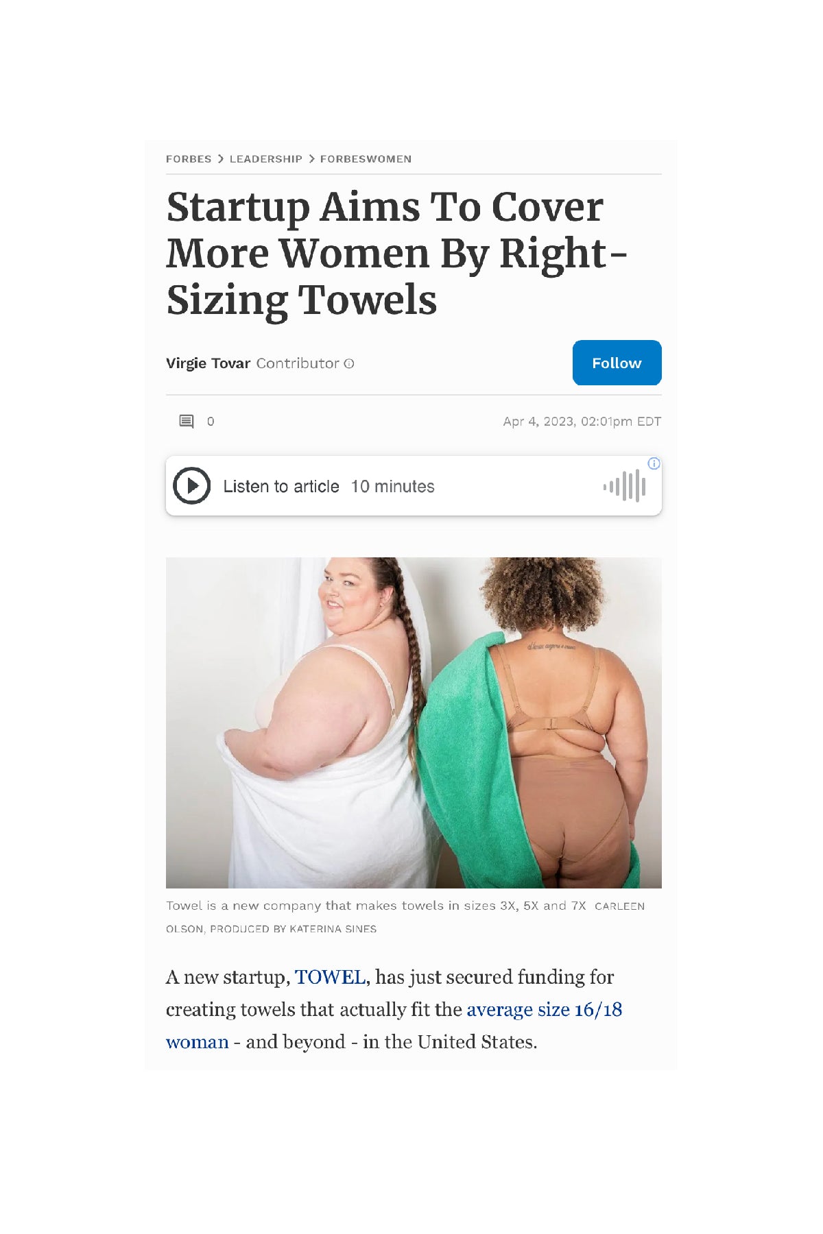 Virgie Tovar, author and activist interviewed TOWEL founder Mary Carney. The article was featured in the Forbes Women in Leadership section and was a true honor for Mary. Virgie spoke about the disparity within the TOWEL Market for the plus size community and what TOWEL is doing to change that.